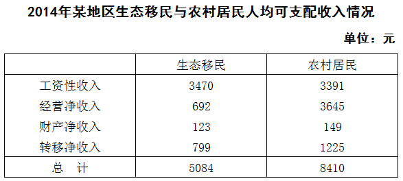 2014年,某地区生态移民人均可支配收入5084元,其中县内移民人均可支配收入4933元,县外移民人均可支配收入5253元,2014年该地区生态移民人均可支配收入比农村居民人均可支配收入低3326元,比该地区山区九县农村居民人均可支配收入低1099元。