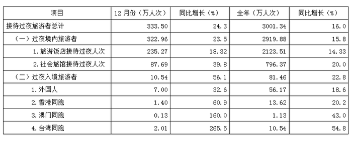 该省2011年12月及全年接待过夜旅客人数