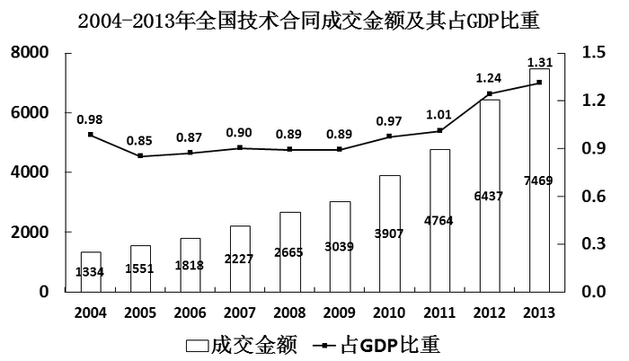 B、2004年—2013年,技术合同成交金额占GDP比重最高和最低的年份相差4年