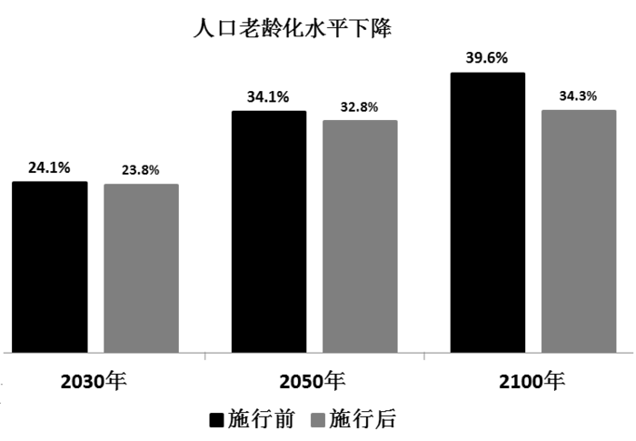 C、2100年,“单独二胎”实施后比实施前老龄化水平下降4.3个百分点