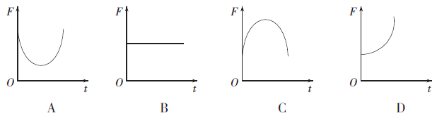 如图所示,水平桌面上摆着一台杠杆,杠杆的左边悬挂着三个砝码,此时,如果在杠杆右边的相同位置施加一个向下的拉力,以保证杠杆的平衡,那么,拉力在图示竖直平面内从左往右沿逆时针旋转的过程中,拉力的大小变化是________。(F表示拉力的大小,t表示从左往右逆时针旋转的时间。)