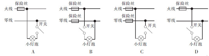 家庭电路的供电线路由两根线组成:火线和零线。在正常情况下,零线与地之间没有电压,火线与地有220V电压,为了安全用电,以下电路符合安装要求的是________。