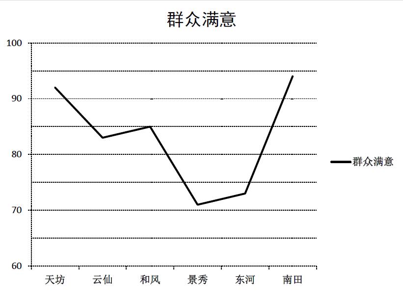 某行政区从“服务态度”“办事效率”“政务公开”三个方面评价下属的6个街道办事处(简称为街道办)的综合服务效能水平,并调查了群众对各个街道办的满意度。这6个街道办分别为天坊街道办、云仙街道办、和风街道办、景秀街道办、东河街道办、南田街道办。每个方面评价分数采用百分制。评价结果如下图: