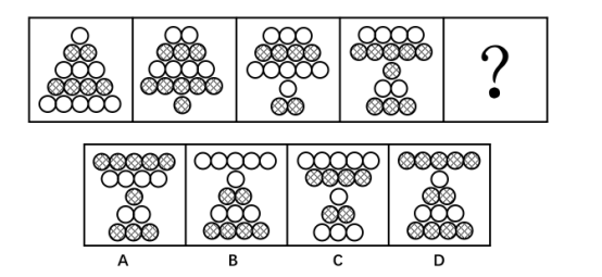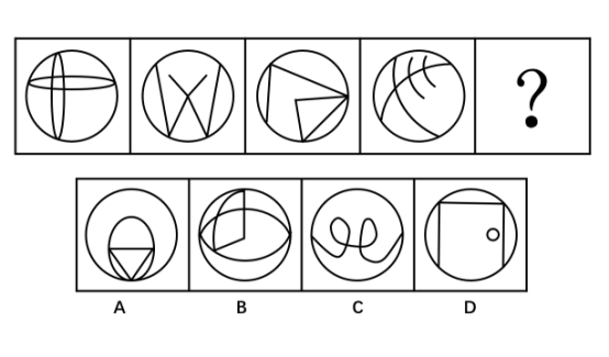 请选择最适合的一项填入问号处,使之符合之前四个图形的变化规律。( )