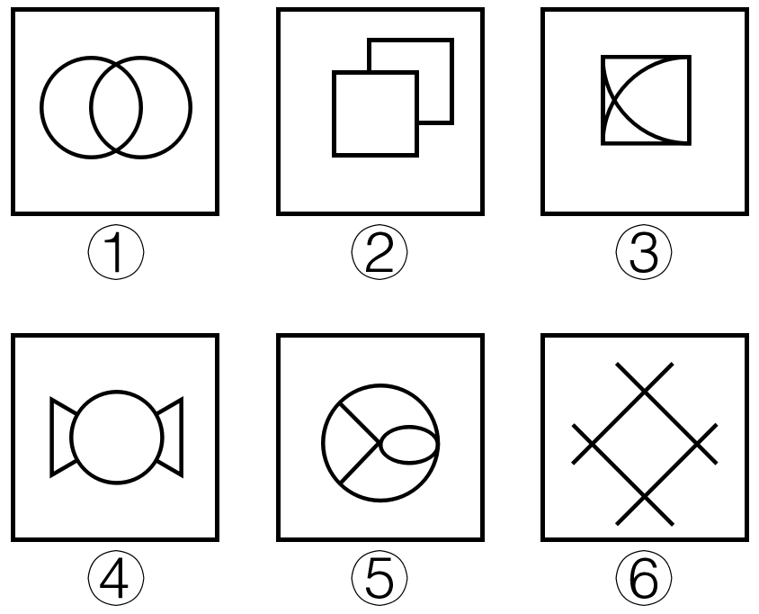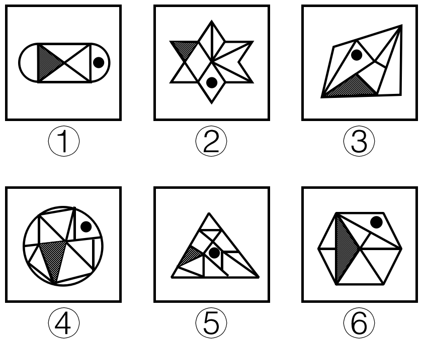 把下面的六个图形分为两类,使每一类图形都有各自的共同特征或规律,分类正确的一项是( )。