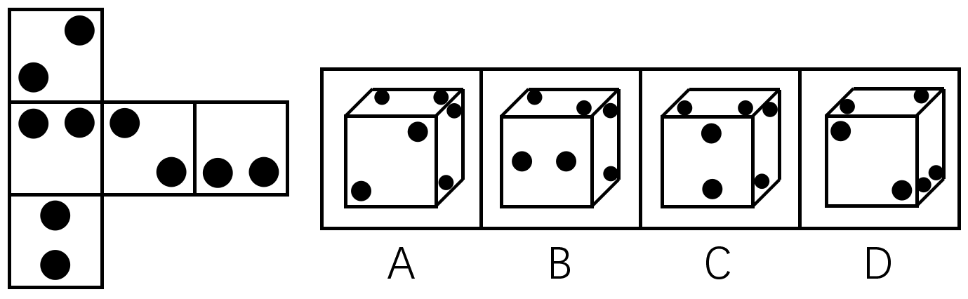 左边给定的是纸盒的外表面,右边哪一项能由它折叠而成?( )。