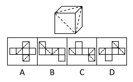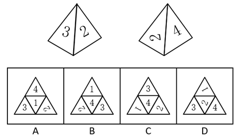 如图所示是从两个不同角度观察到的同一个正四面体的外表面,将该四面体展开,可能得到的图形是( )。