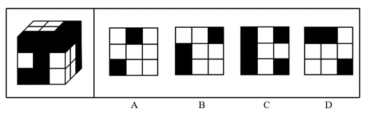左图为17个同样大小的白色实心正方体和10个同样大小的灰色实心正方体堆叠而成的大正方体,将其从任一面剖开,以下哪个不可能是该正方体的截面?( )