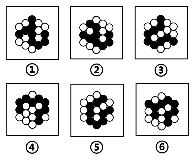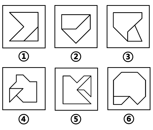 把下面的六个图形分为两类,使每一类图形都有各自的共同特征或规律,分类正确的一项是( )。