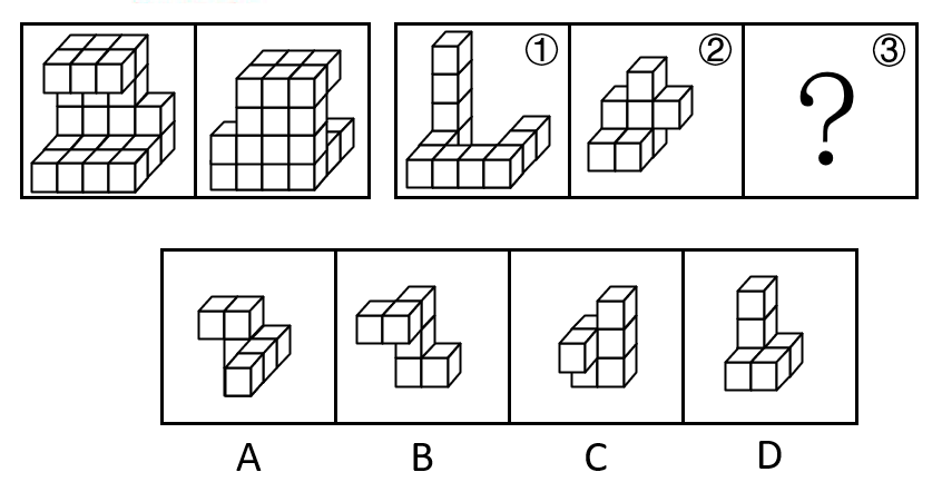 左图给定的是由相同正方体堆叠成的多面体的正视图和后视图。该多面体可以由①、②和③三个多面体组合而成,问以下哪一项能填入问号处?