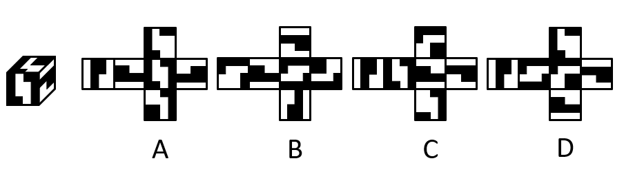 左图给定的是正方体纸盒,右边哪项可能是其正确的外表面展开图?