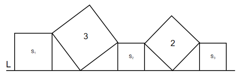 如图所示,在直线L上依次摆放着5个正方形。已知斜放置的2个正方形的面积分别是3和2。正放置的3个正方形的面积依次是、