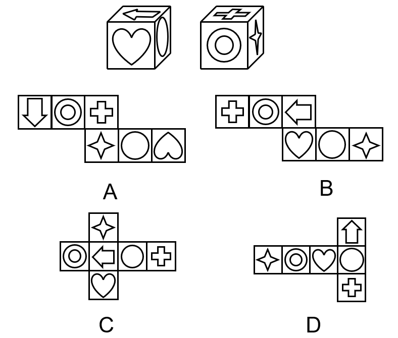 图①和图②分别是某立方体从不同角度的视图,下列哪项不可能是该立方体的外表面展开图?