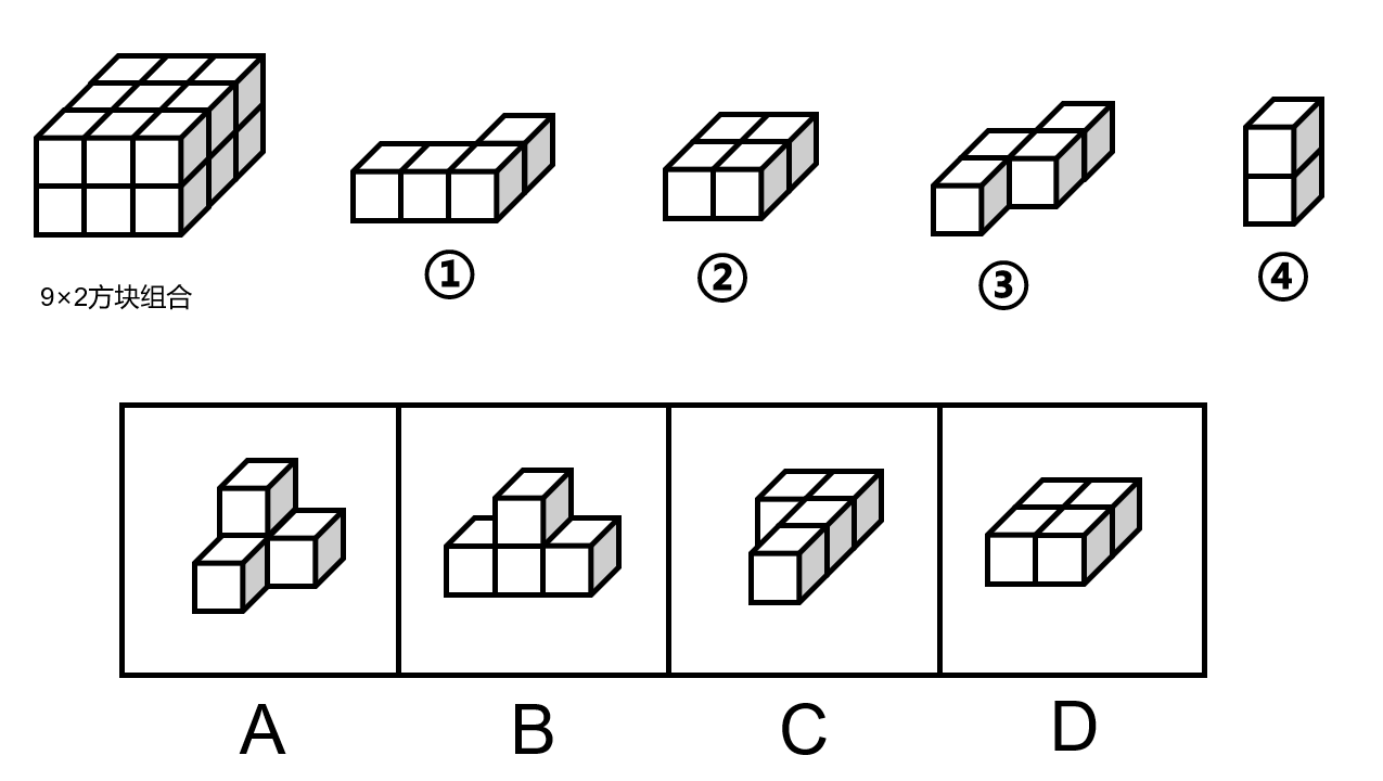 从所给四个选项中,选出能与给定的①、②、③、④零件共同构成如下图所示的方块组合的一项: