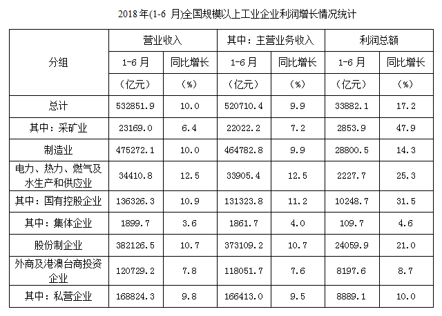 2018年1-6月,全国规模以上工业企业实现利润总额33882.1亿元,同比増长,増速比1-5月份加快0.7个百分点。