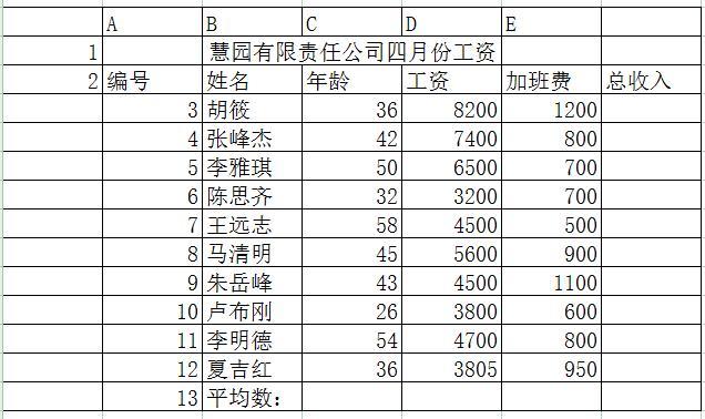 (1)利用函数公式,求出公司员工的平均年龄、工资、加班费及总收入。