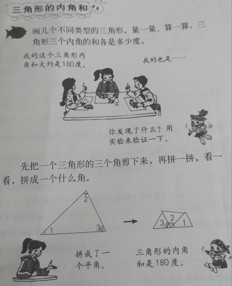 义务教育课程教科书《数学》四年级下册(人教版)关于“三角形的内角和”的教学内容如下: