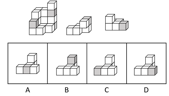 下图最左边的多面体由15个等大的白色正方体和3个等大的灰色正方体堆叠而成,其可以由右边2个小多面体和另一多面体组合而成,该多面体是: