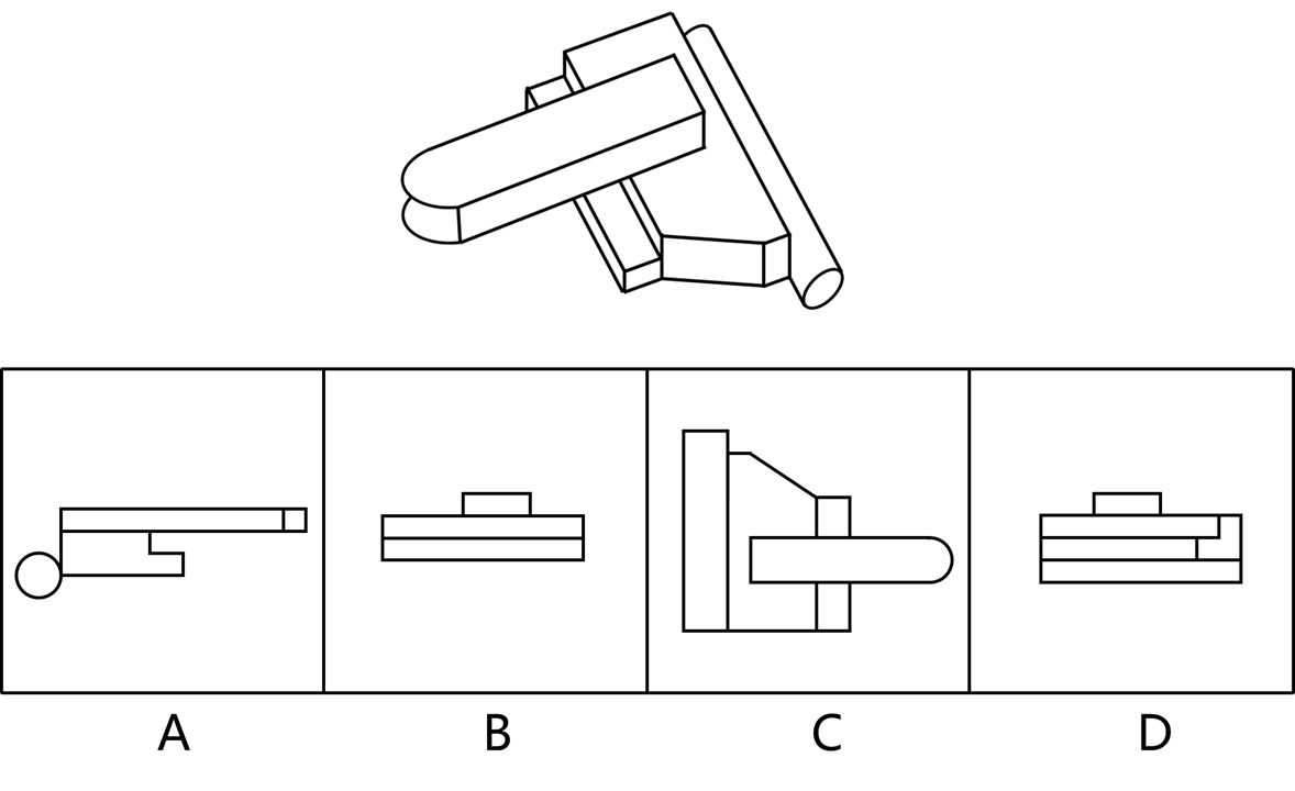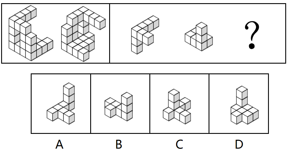 下面主图是由相同正方体堆叠而成的多面体的两个不同方向的视图,从所给的四个选项中选择一项填入问号处,使得右图三个多面体可以组合成左图( )。
