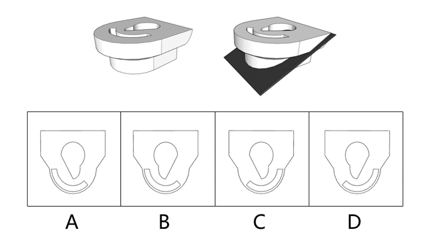 下面所示左边立体图,从右边灰色平板位置切开后,其下半部分的顶视剖面图是( )。