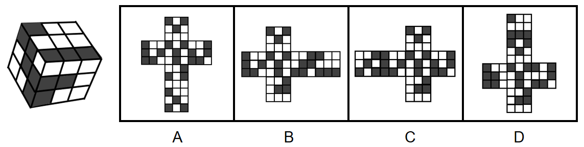 下面左图给定的是正方体纸盒,右边哪项是其正确的外表面展开图?( )