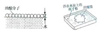 利用油酸酒精溶液平静的水面上形成单分子油膜,将油酸分子看作球形,测出一定体积油酸溶液水面上形成的油膜面积,用计算出油膜的厚度,其中