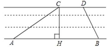 京杭大运河是世界文化遗产。为测量某段运河的河宽(岸沿是平行的),如图,在岸边分别设点A、B、C、D,先用卷尺量得AB=160m,CD=40m,再用测角仪测得∠CAB=30°,