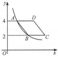 如图,平面直角坐标系中,菱形ABCD在第一象限内,边BC与x轴平行,A,B两点的纵坐标分别为4,2,反比例函数的图象经过A,B两点,若菱形ABCD的面积为2,则k的值为( )。