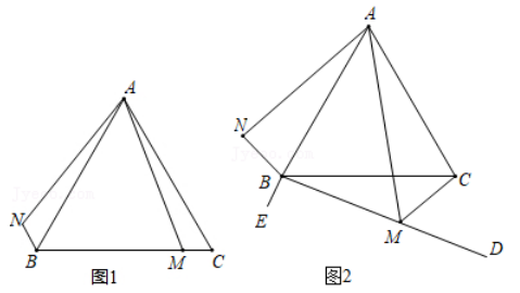 (2)如图2,点E是AB延长线上一点,若M是内部射线BD上任意一点,连接MC,(1)中结论是否仍然成立?若成立,请给予证明,若不成立,请说明理由。