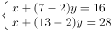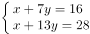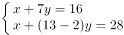 某出租车起步价所包含的路程为0~2km,超过2km的部分按每千米另收费。津津乘坐这种出租车走了7km,付了16元;盼盼乘坐这种出租车走了13km,付了28元。设这种出租车的起步价为x元,超过2km后每千米收费y元,则下列方程正确的是( )。