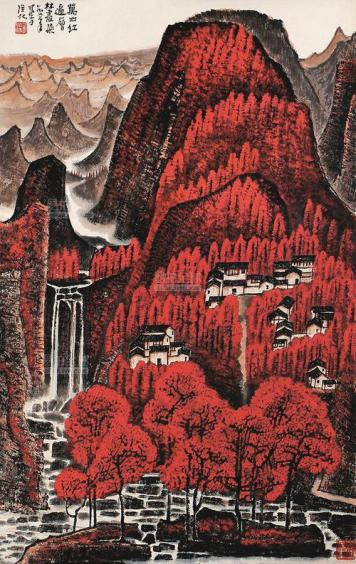 简述下图《万山红遍》的作者及其表现手法。