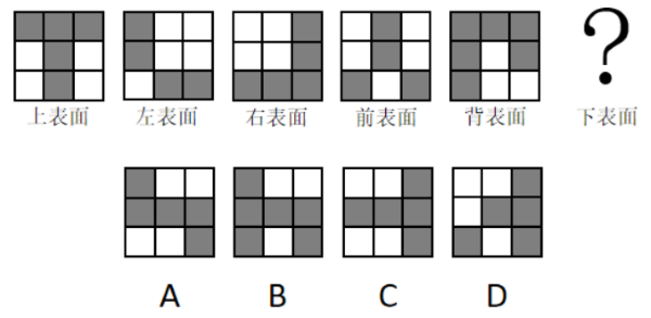 如图所示为某立体图形的表面形状,则该立体图形的下表面是下列选项中的: