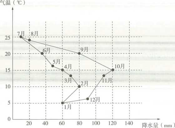 气候数据有多种呈现方式。把代表月份的数字标注在以气温和降水量为坐标的图上,某个月份的点在图中的坐标就是该月的平均气温和降水量。读下图,关于该地的描述正确的是( )。