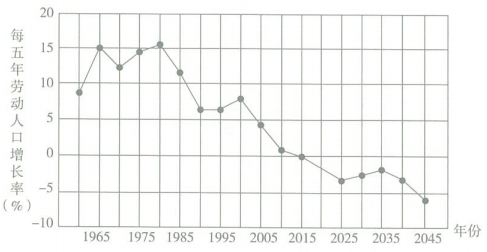 读我国1960-2045年劳动人口增长率变化图(含预测),完成11~12题。