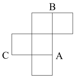 如图是一个无盖正方体盒子展开后的平面图,A、B、C是展开图上的三点,则在原正方体盒子中的大小是( )。