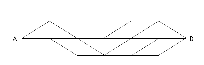 A、B两地之间的道路如下图实线所示。张某从A地前往B地,且途中只能向正东,东北或者东南方向行进,问有多少种不同的行进路线可供选择?( )