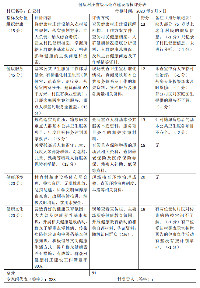 听了董书记的汇报,专家组又查阅了相关资料,进行了实地查看,情况与董书记汇报的大体一致,但也发现了一些小问题,经讨论,专家组在《健康村庄省级示范点建设考核评分表》上对白云村进行了初评打分,并列出了整改事项和时限要求。