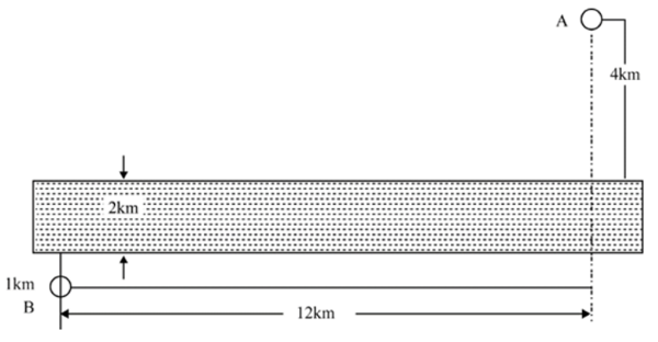 A、B两个乡镇分布于山谷两侧,山谷间有一条宽为2km的河道(如下图所示)。当地政府决定在两个乡镇间修建一条跨河公路促进旅游发展。由于架桥费用高昂,所以要求跨河公路中的桥梁路段长度最短。那么根据图中数据,从A镇前往B镇的最短距离为: