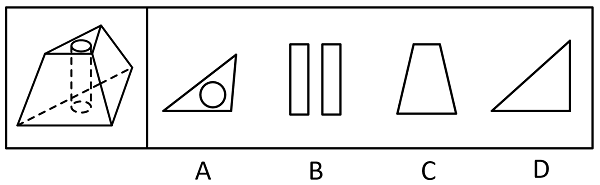 下面的三棱台如图所示,从中挖掉一个圆柱体,然后从任一面剖开,哪一项不可能是该三棱台的截面?