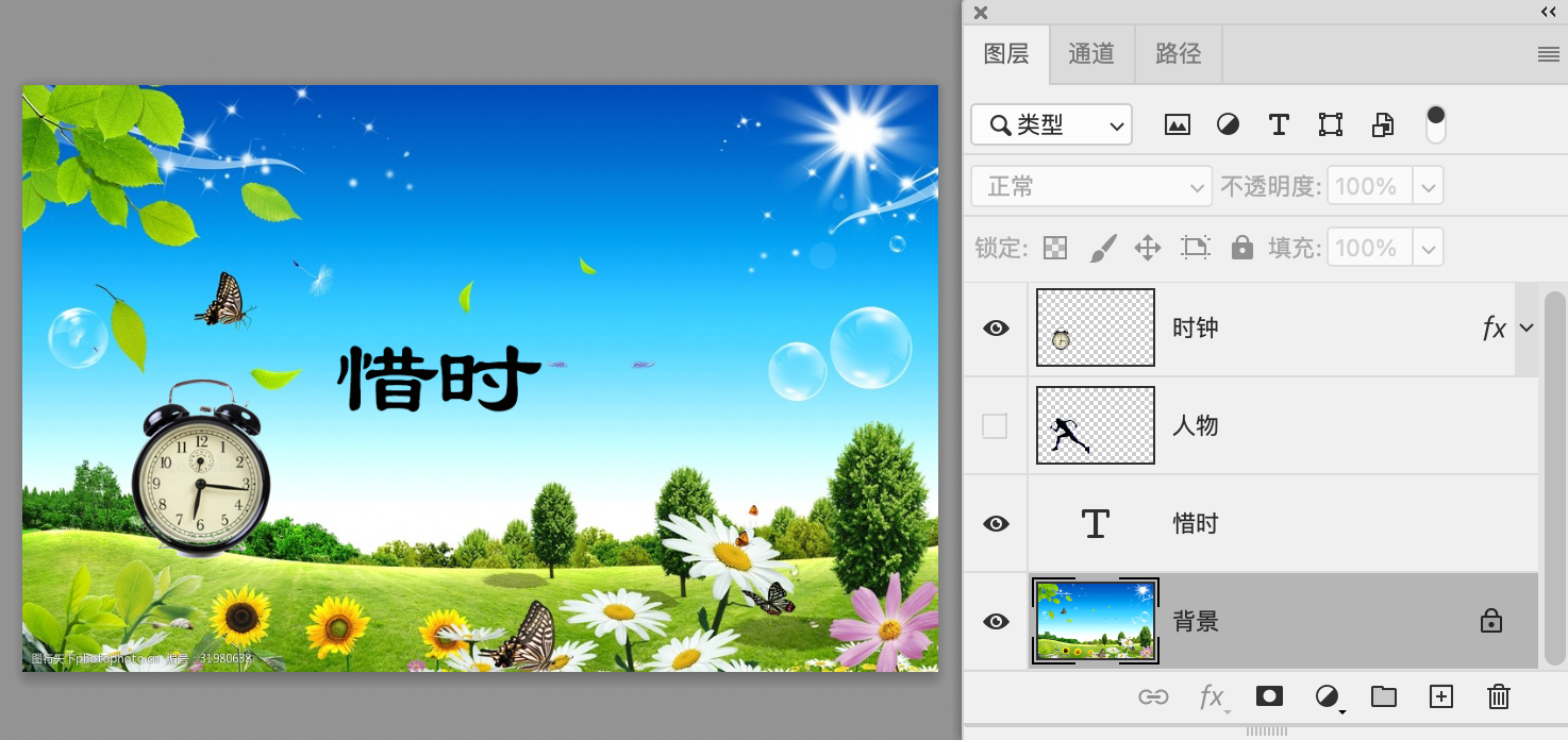 使用Photoshop软件制作“惜时”作品,部分界面如下图所示,下列说法正确的是( )。