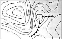 图3为北半球某区域近地面等压线(单位:hPa)分布图,呈现自西向东移动的天气系统,读图完成第5-6题。