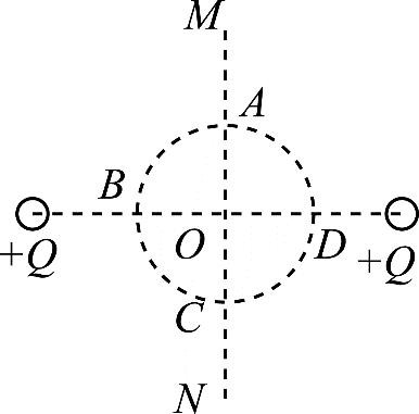 如图所示,MN为两个等量正点电荷连线的中垂线,O为两点电荷连线的中点。A、B、C、D到O点的距离相等,则下列说法正确的是( )。