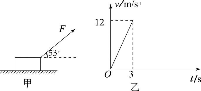 (4分)如图所示,放置在水平地面的物块与水平方向夹角为53º的拉力F的作用下向右运动,物块运动3s后撤去拉力,在0-3s内物块运动的速度v与时间t关系如乙图所示,已知物块质量m=3kg,F=25N,g=10,sin53º=0.6,求: