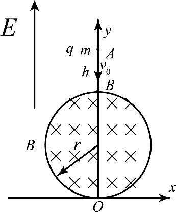 (6 分)如图所示,竖直向上的匀强电场分布在整个坐标平面内,半径为r的圆形区域匀强磁场交x轴于O点,且圆心在y轴上,质量为m,带电量为q的小球由A点沿y轴负方向以做匀速直线运动,至B点进入磁场,已知磁场磁感应强度大小为B,方向垂直纸面向里,半径