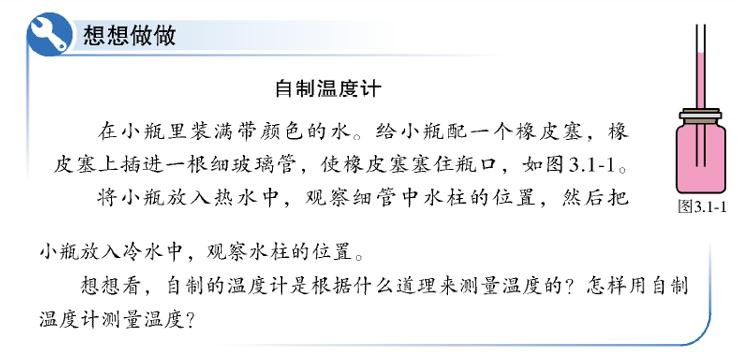 (3)如图为人教版初中物理教材“温度”一节中的“想想做做”栏目——“自制温度计”。“想想做做”栏目是教材从培养学生创新知识和实践能力的角度设计的实践体验活动。谈谈你对上述教学过程的改进建议。