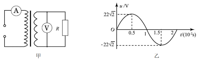 如图甲所示,理想变压器原、副线圈的匝数比为 10:1,电阻R=22,各电表均为理想电表。电阻R两端的电压u随时间t的变化规律如图乙所示,下列说法正确的是( )。