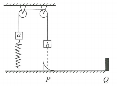 如图所示,质量分别为m、2m的物体a、b通过轻绳和不计摩擦的定滑轮相连,均处于静止状态。a与水平面上固定的劲度系数为k的轻质弹簧相拴连,Q点有一挡板,若有物体与其垂直相撞会以原速率弹回,现剪断a、b间的绳子,a开始上下往复运动。b的正下方有一高度可忽略不计的弧形挡板,能够使得b下落至P点时以原速率水平向右运动,当b静止时,a恰好首次到达最低点,已知PQ长,重力加速度为g。b距P高h,且仅经过P点一次,b滑动时的动摩擦因数为