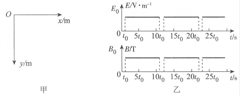 时刻该空间同时加上如图乙所示的电场和磁场,其中电场沿-y方向(竖直向上),场强大小