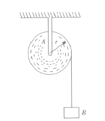如图所示,质量的实心圆柱体A,其半径15cm,可以绕其固定水平轴转动,阻力忽略不计。一条轻的柔绳绕在圆柱体上,其一端系一个质量