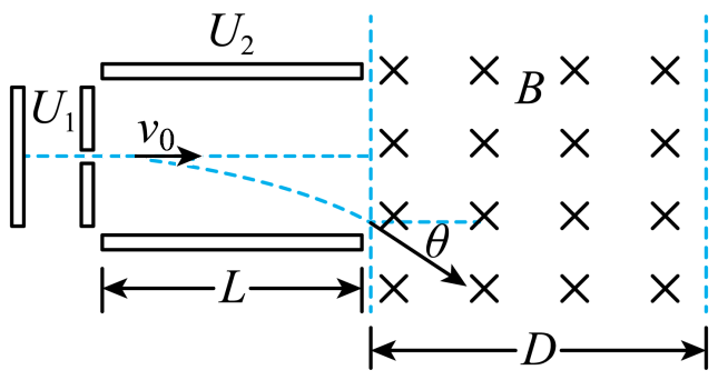 (2)若微粒射出电场过程的偏转角为,并接着进入一个方向垂直与纸面向里的匀强磁场区,则两金属板间的电压